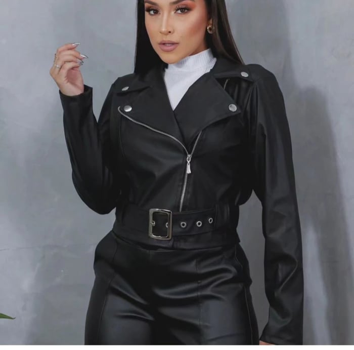 Jaqueta courino com detalhes em fivela super tendência nesse outro e inverno