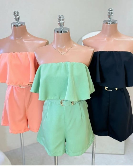 Macacão curto com babado e cinto, elegante e feminino. A modelagem valoriza a silhueta, perfeito para ocasiões casuais e eventos descontraídos com muito estilo.